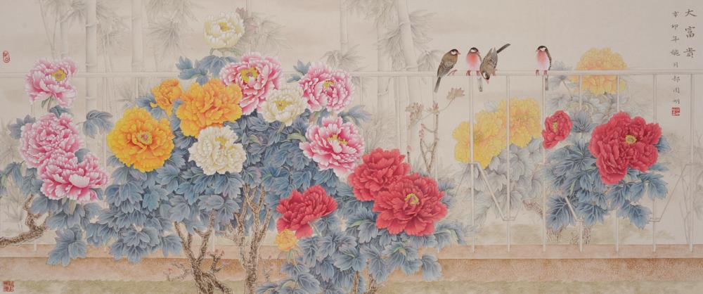 此作品是描绘牡丹花开季节群鸟嘻戏,寓意大富大贵